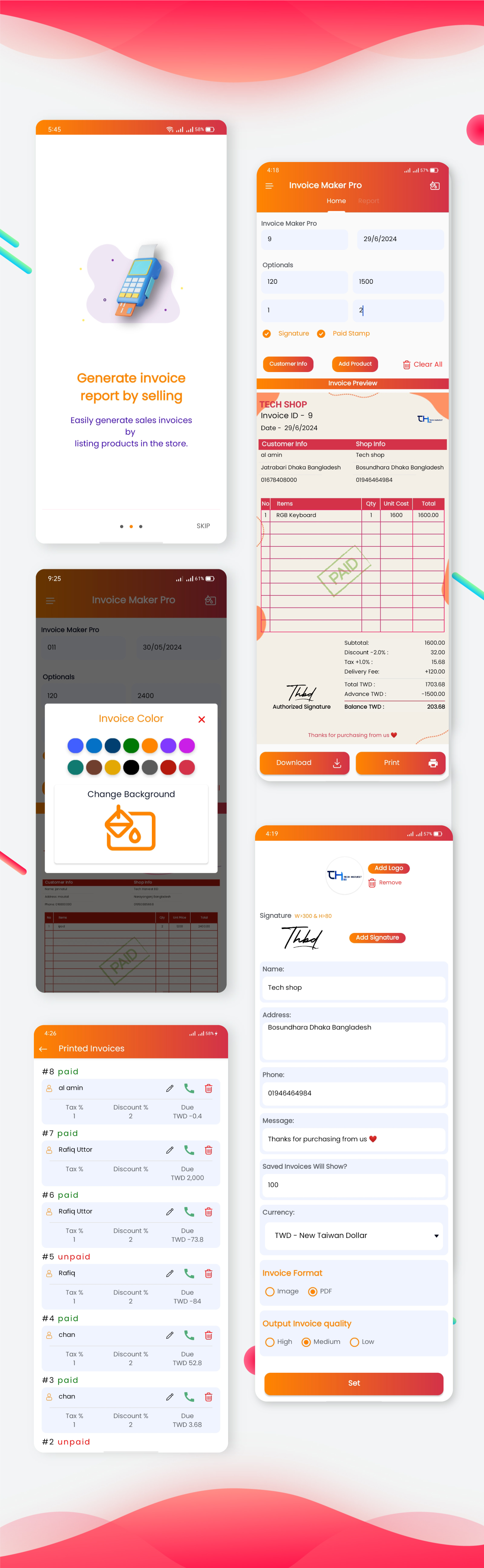 • User can change the background, such as image, color, etc., of the invoice from the home page.